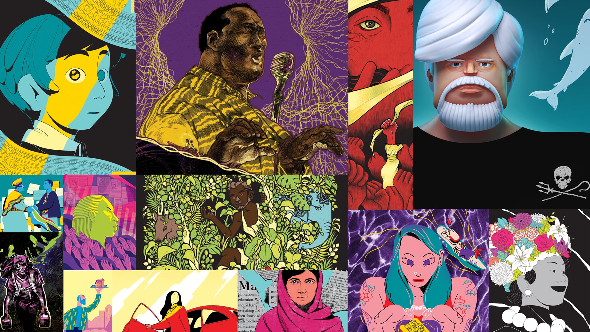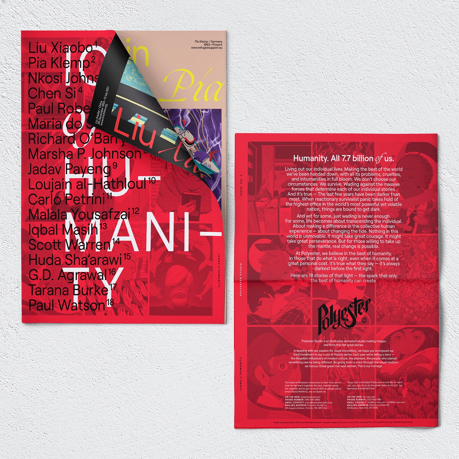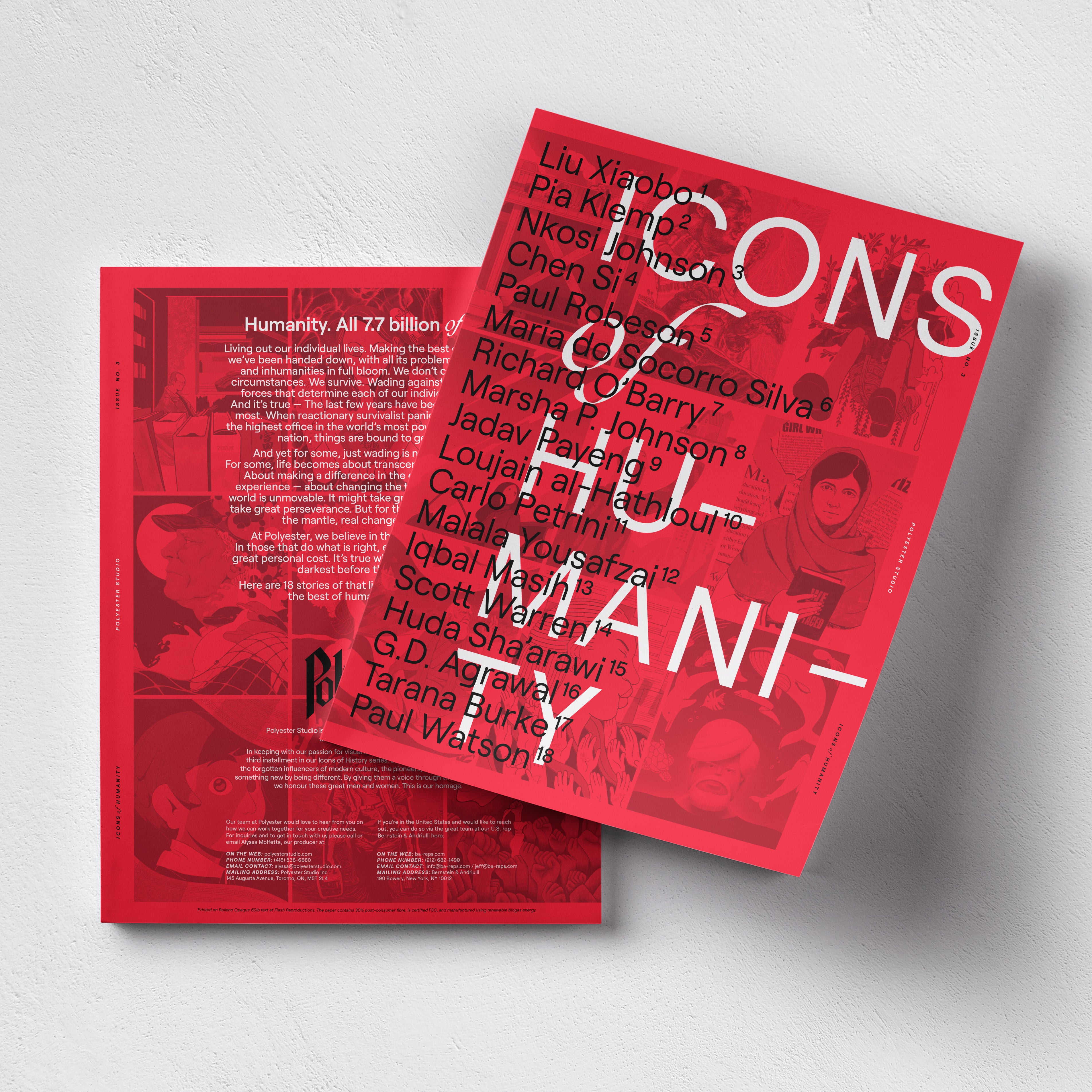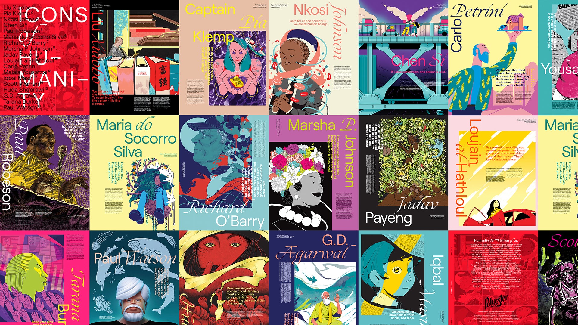 Illustrative tabloid featuring people in history who went beyond the expected and became Icons of Humanity.