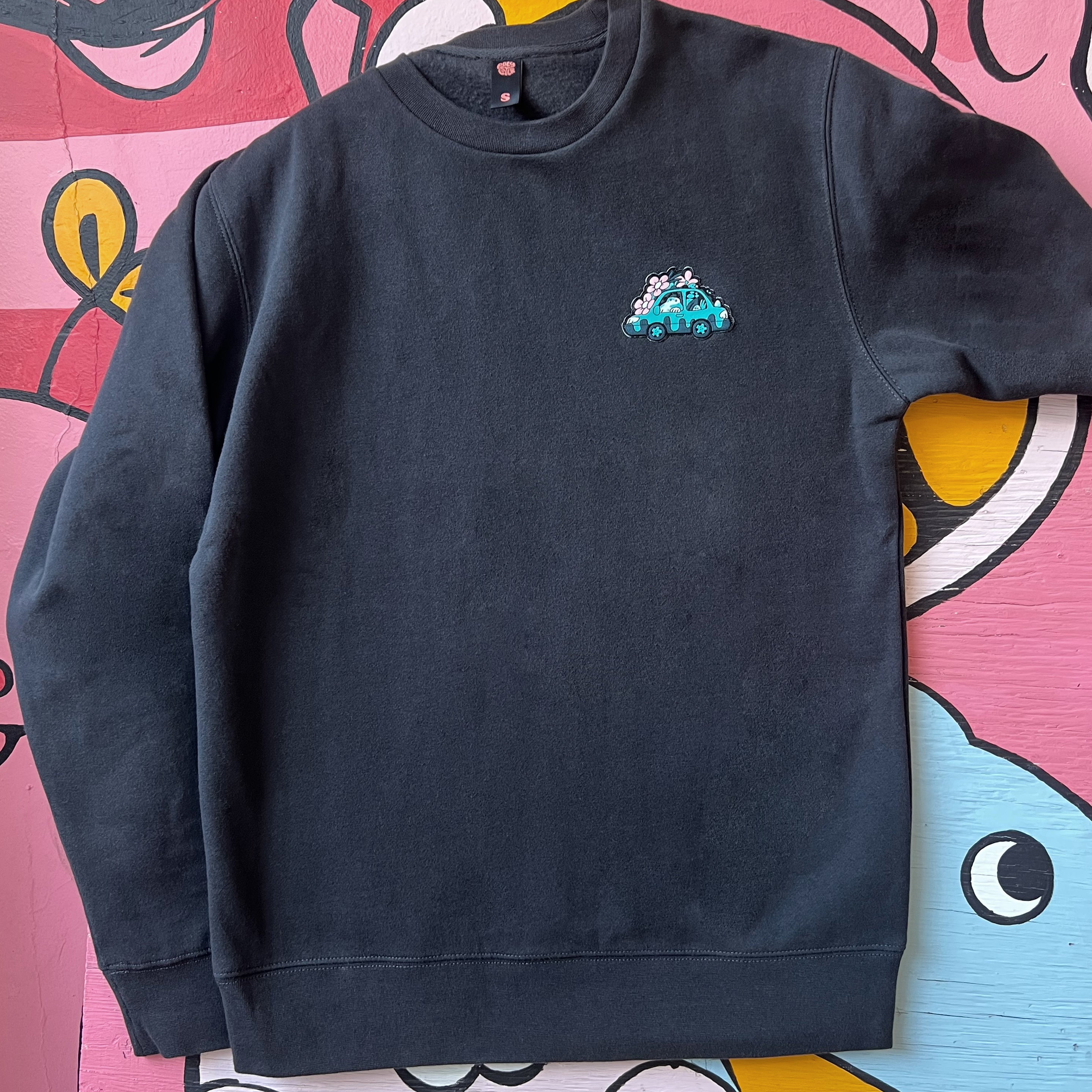 Premium heavy weight sweater with garden car gnome character patch on front chest.